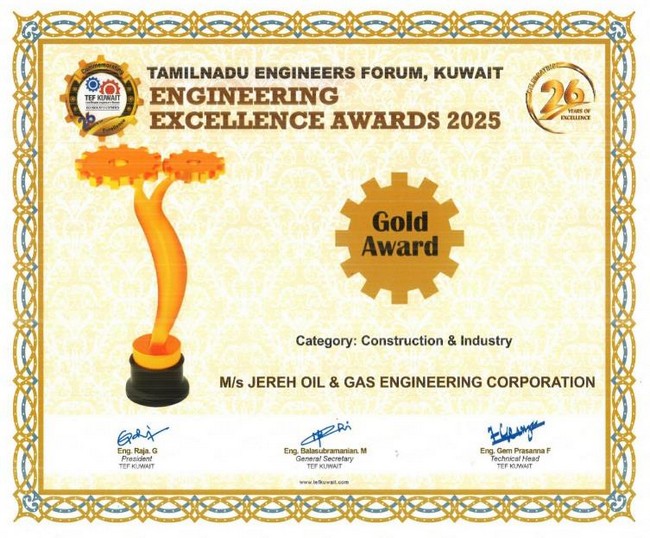 Jereh Oil & Gas Engineering Corporation received the Gold Award in the Construction & Industry category for the high-quality delivery of the Jurassic Production Facilities 5 (JPF-5) project for Kuwait Oil Company (KOC) at the 16th TEF Technological Innovations Conference & Exposition (TICE) and the 9th Engineering Excellence Awards Ceremony in Kuwait. The award, presented by senior representatives from KOC and Kuwait National Petroleum Company (KNPC), recognized Jereh’s excellence in project execution and delivery.